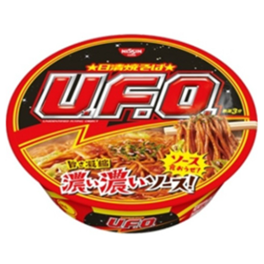 やみつき濃厚ソースが旨い、日清焼そばU.F.O.。具材は、大切りキャベツと豚肉、別添で青のりと紅生姜のふりかけ付です。