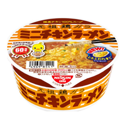 チキンラーメンどんぶりのミニサイズ。ふんわり半熟風卵が入っています。